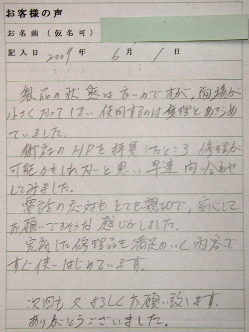| 本当にこの度はご来店くださいましてありがとうございました。 片道3時間と聞いたときには、驚きましたが逆に絶対にいい加減な修理はできないと思いました。(もちろん製品を送ってくれた方も同じ気持ちですよ)メーカーでの修理金額より半額以下で綺麗にできたと思います。 やはりお客様と直接コムニケーションが取れるのは修理する側にとってもうれしいことです。 お近くの方は是非1度ご来店下さい。絶対に新しい製品は勧めませんのでご安心を! |